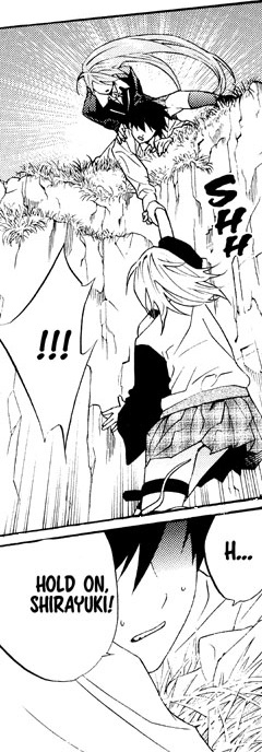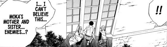 I did find a couple of things interesting in this volume. The first was the juxtaposition of the two Mokas. In the previous volume Inner Moka was allowed out for the day with the predictable result: we're stuck with the broody, violent, doesn't like anybody Inner Moka permanently. She can't transform back into dear, sweet, innocent, loves everybody Outer Moka. My point to make here is that I think the names are reversed. Keep in mind that the silver haired Moka was what everybody else knew before the creation of the pink haired Moka. So the people who know Moka now call sweet Moka “Outer” and Super Vampire Moka “Inner.” It's really just the opposite. I can't possibly know if this is what the author intends, or is something I'm reading too much into.